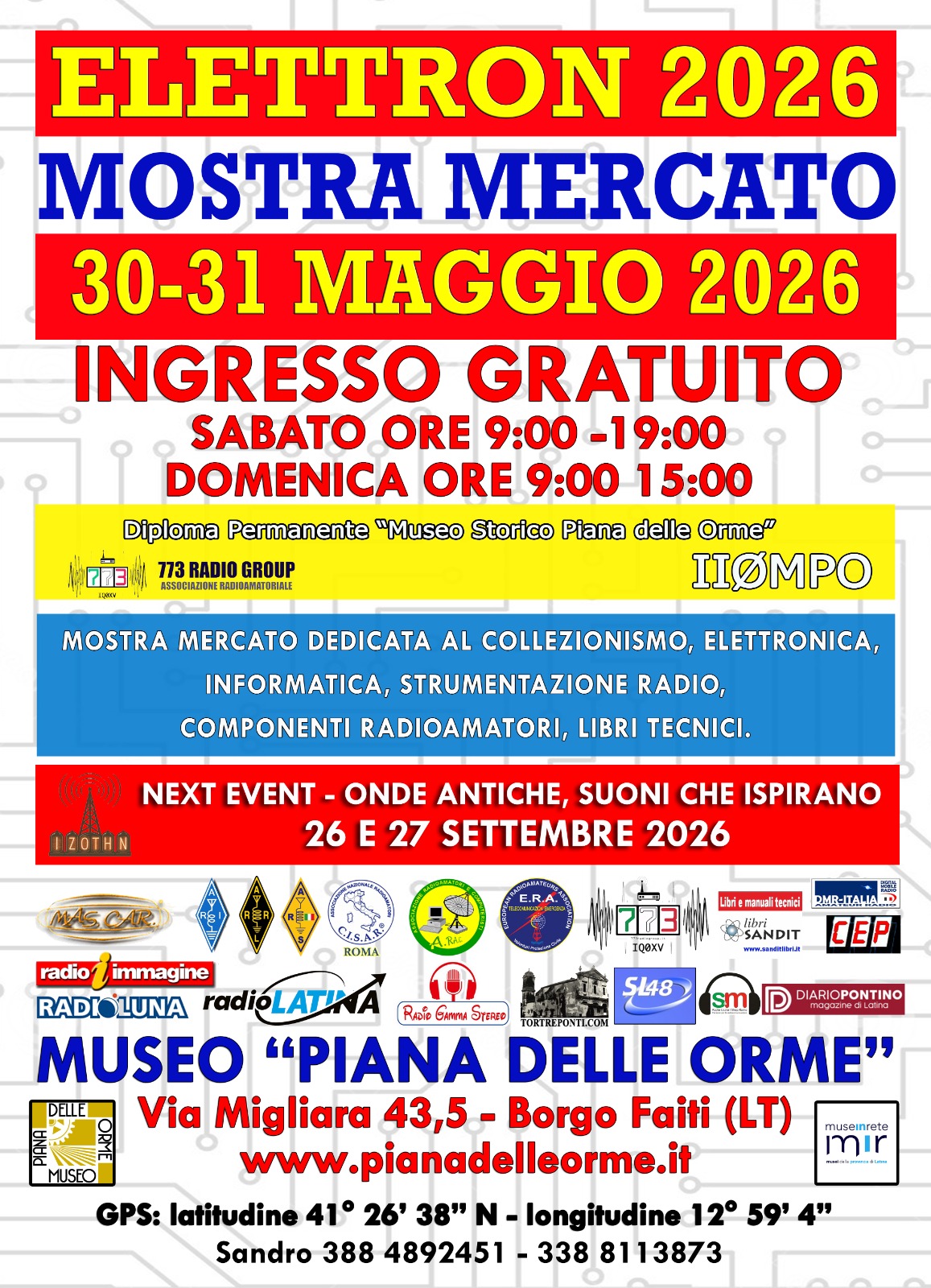 Ai Soci, agli Amici ed ai Simpatizzanti, rendiamo noto che nei giorni 30 e 31 maggio, a Piana delle Orme (Lt) si svolgera' ELETTRON 2026 Collaudata Mostra Mercato di collezionismo, informatica, elettronica e di materiale per Radioamatori Come sempre la nostra Sezione sara' presente col proprio "Stand", sempre pronta a ricevere Soci, Amici e Simpatizzanti, per una chiacchierata, un caffe', un aperitivo...